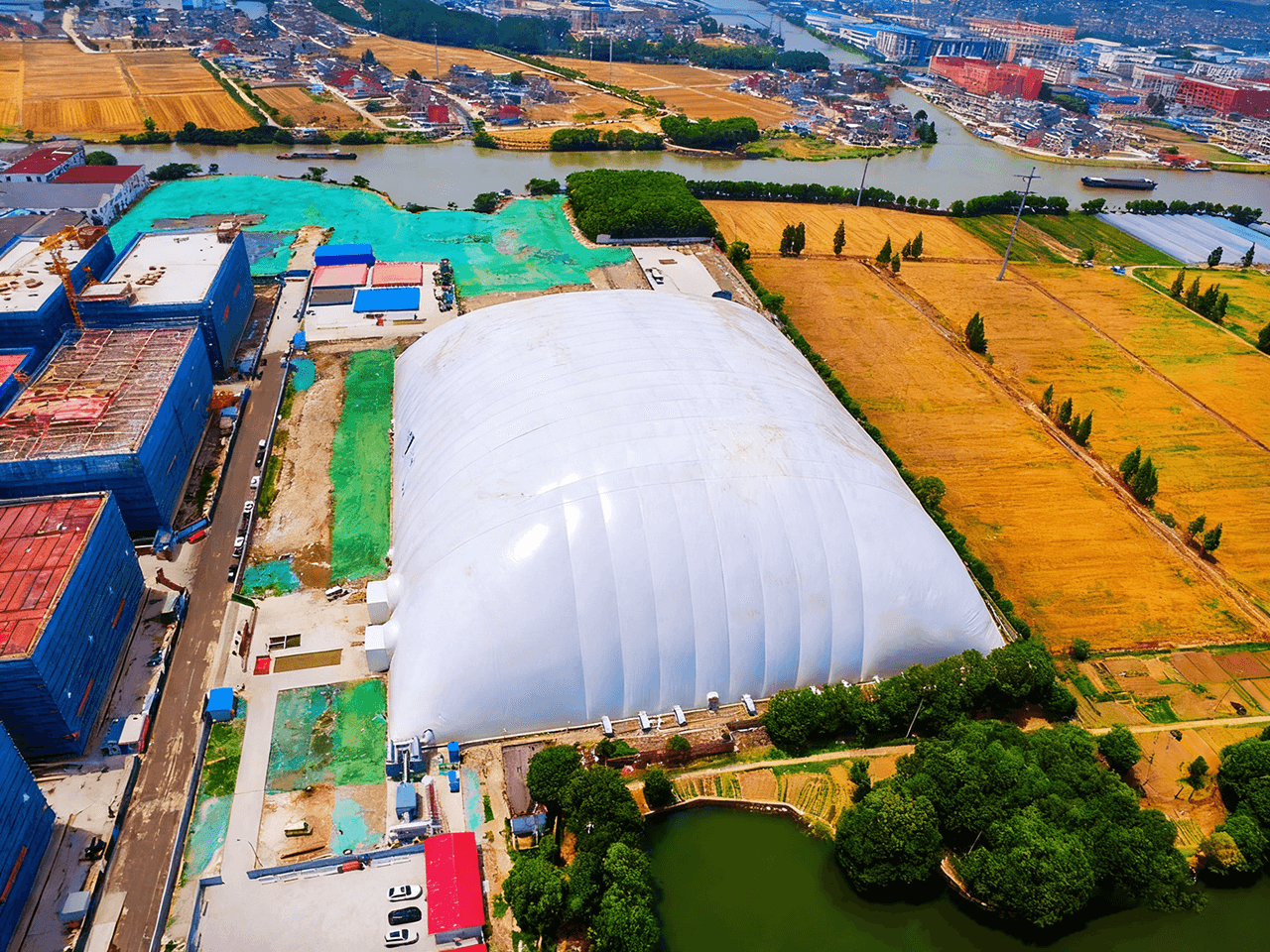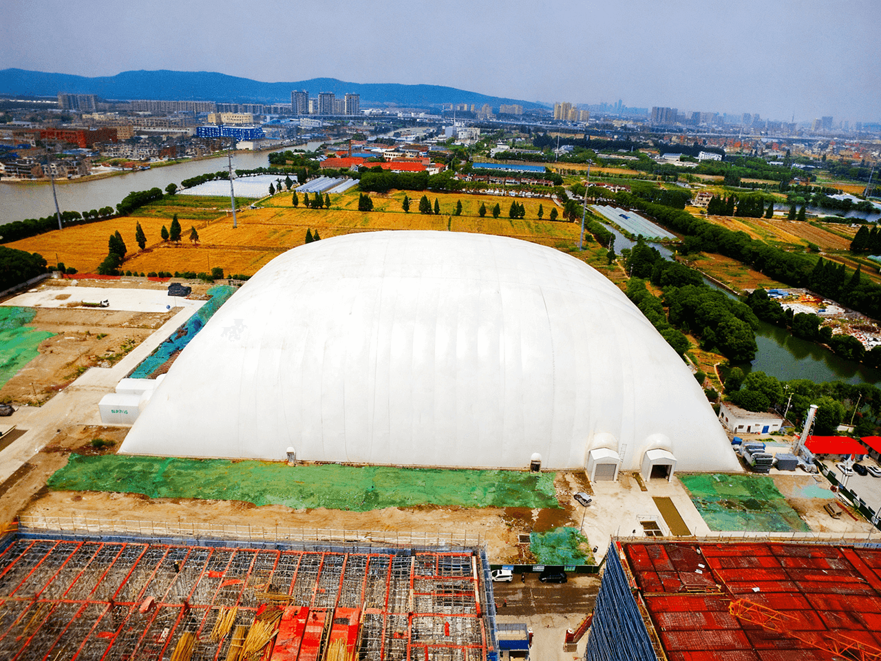 Product Introduction for Changshu Land Parcel Emergency Restoration Project: The Air Dome, a cutting-edge temporary structure, serves as a key facility in the emergency restoration initiative. Its massive white dome design, featuring the project logo, stands prominently amidst the construction site. With superior durability and rapid deployment capability, the Air Dome provides a controlled environment essential for efficient restoration work. Surrounded by ongoing construction, waterways, and greenery,